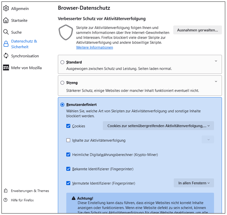 - Klick auf "Benutzerdefiniert" und schalte "Inhalte zur Aktivitätenverfolgung" aus.